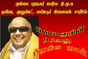 கலைஞர் பிறந்தநாள்: மும்பை புறநகர் மாநில தி.மு.க தானே, முலுண்ட், பாண்டுப் கிளைகள் சார்பாக தலைவர் கலைஞரின் 96 ஆவது பிறந்தநாள் விழா வருகின்ற 23.06.2019 ஞாயிறு அன்று மாலை 6.30 மணிக்கு முலுண்ட் வித்யா மந்திர் அரங்கத்தில் நடைபெறுகிறது. [மேலும் படிக்க...]