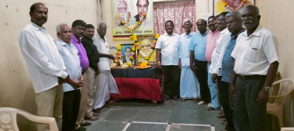 பொறுப்பாளர் கருவூர் இரா.பழனிச்சாமி வரவேற்புரையாற்ற, மும்பை திராவிடர் கழகத் தலைவர் பெ. கணேசன் பெரியார் திருவுருவப் படத்திற்கும், பணகுடி மா. சண்முகவேல் பேரறிஞர் திருவுருவப் படத்திற்கும், முத்தமிழறிஞர் திருவுருவப் படத்திற்கு என்.வி.சண்முகராசன் மாலையிட்டு மலர் தூவி மரியாதை செலுத்தினர்.